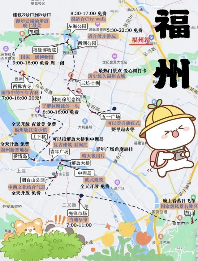 福谈空中栈谈捉迷藏,三坊七巷喂锦鲤。儿童公园坐摩天轮,闽江夜游看灯光秀,鱼丸肉燕吃到扶墙走!